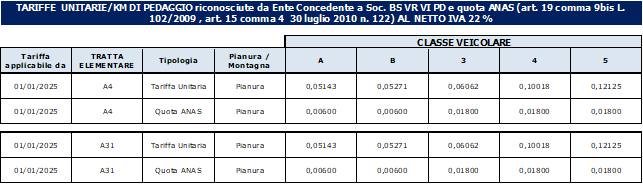 La tariffa unitaria chilometrica di pedaggio applicabile dal 01/01/2025 è la seguente: